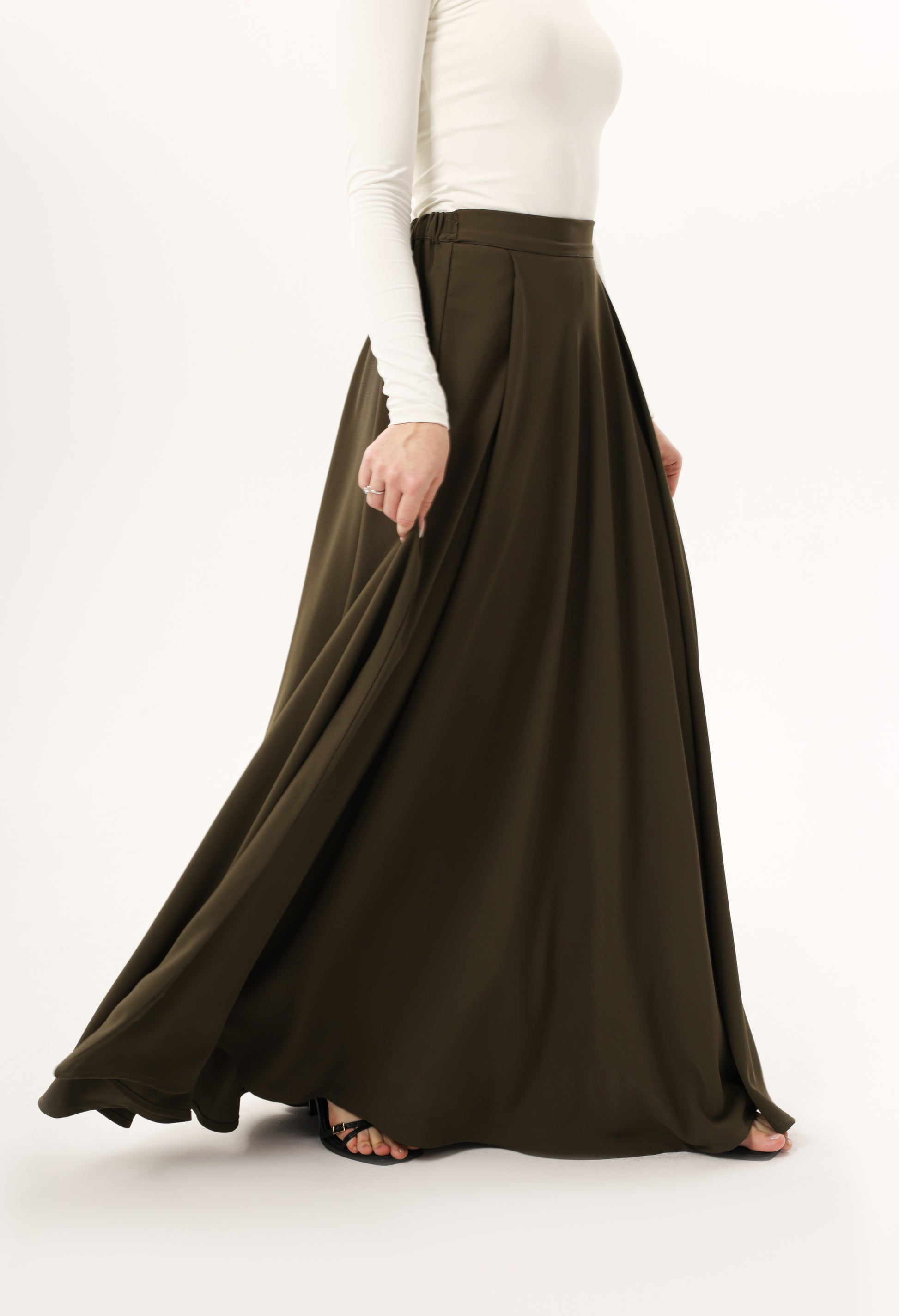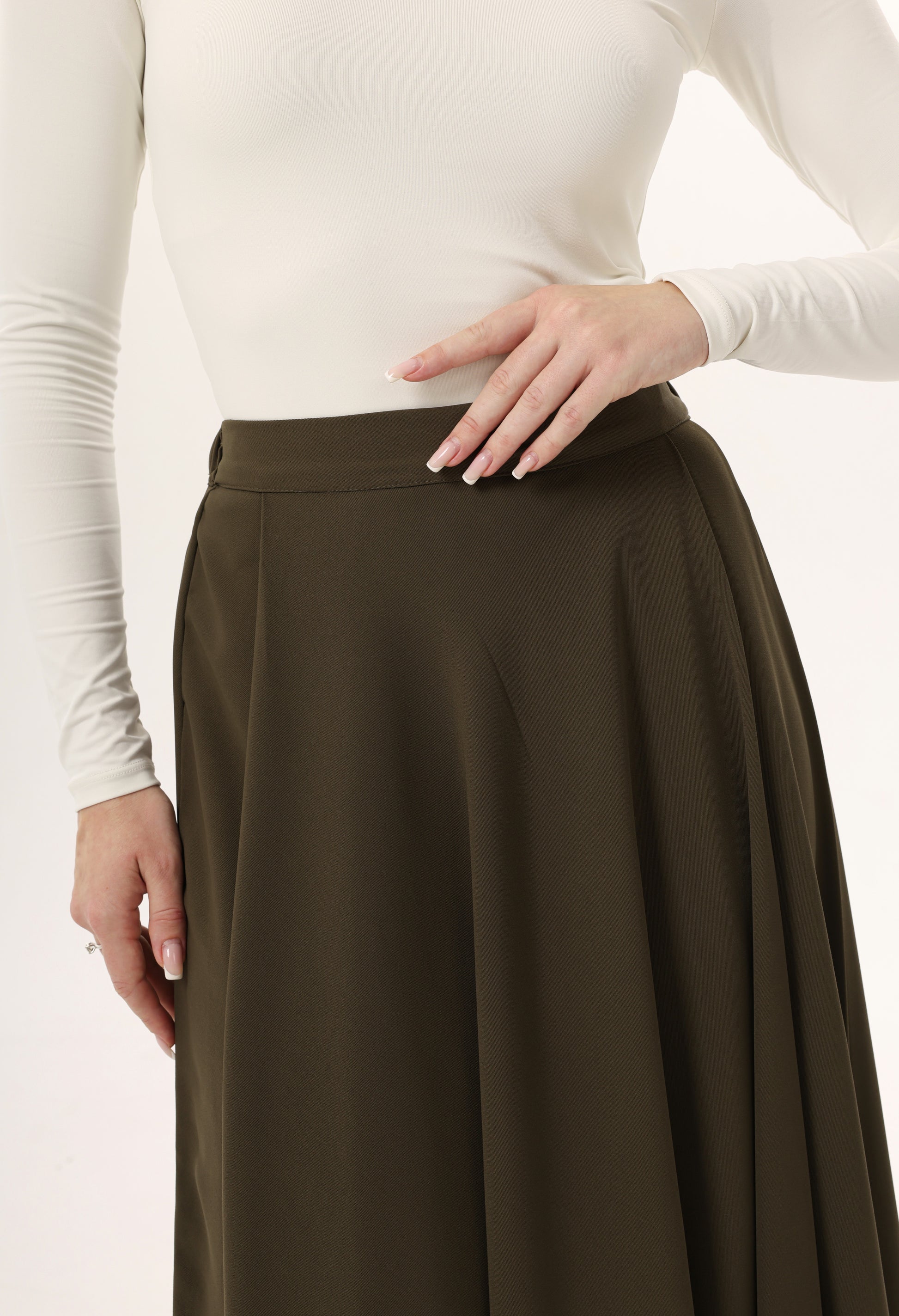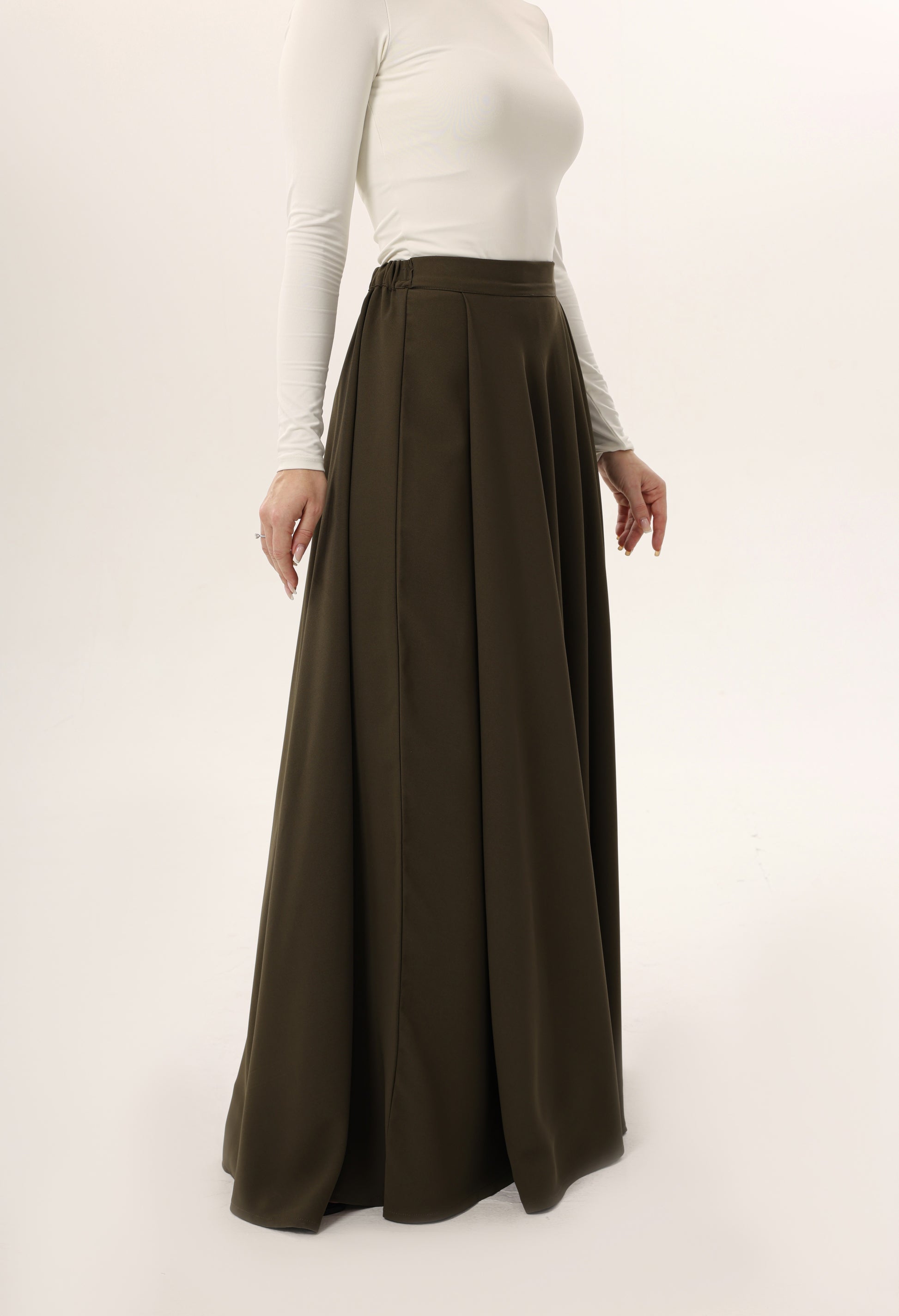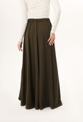 This full-length skirt features a high, fitted waistband that flows into a sweeping A-line silhouette. Designed with soft pleats that release into fluid movement, it offers both ease and elegance in every step. The elongated cut provides full coverage while maintaining a light, graceful drape, making it versatile for both day and evening wear. Minimalist in design, it serves as a timeless foundation piece, effortlessly paired with tailored jackets, crisp blouses, or relaxed knitwear. Rendered with tonal stitching, it balances structure and fluidity with understated refinement.