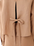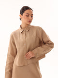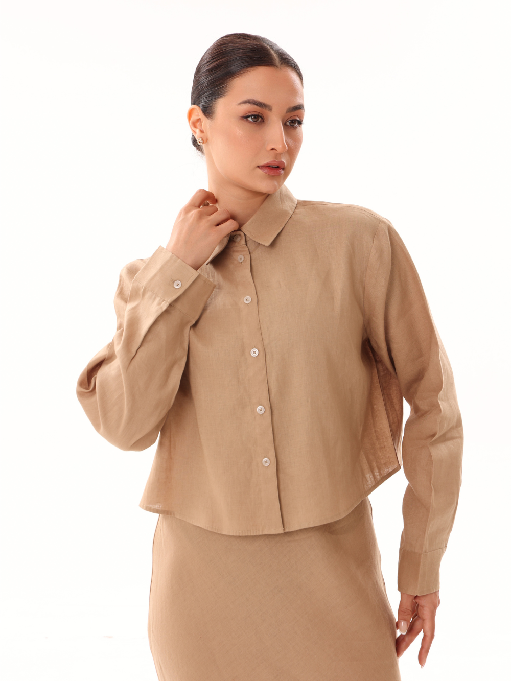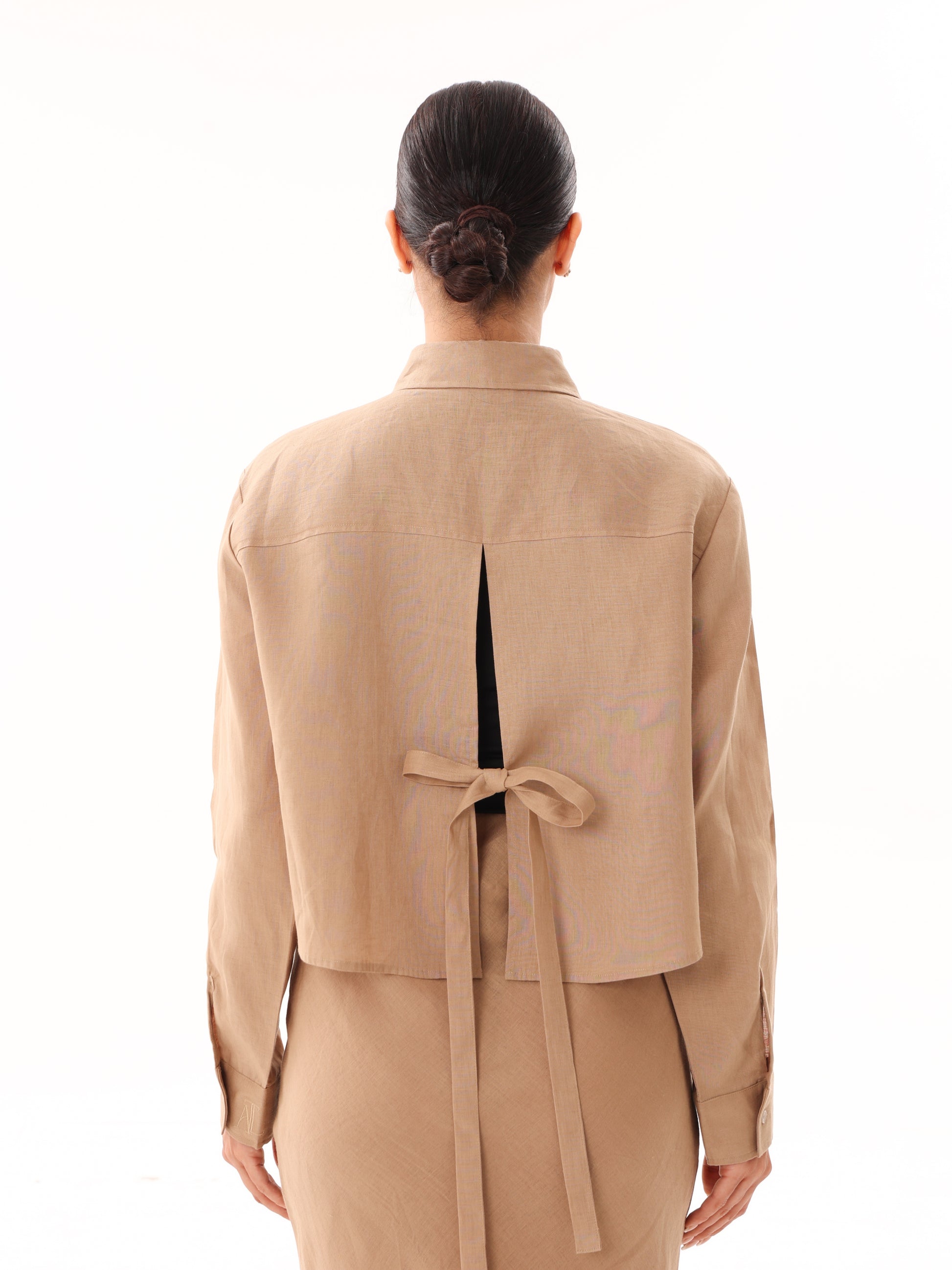 A trendy cropped button-up showcasing an open back with a long, elegant bow. Made from 100% linen, it is lightweight and breathable, making it ideal for warmer weather. Designed to layer beautifully over our linen underdress for a chic, modest look, or can be paired with our linen trousers or maxi skirts for a stylish ensemble. Either way, you’re sure to stand out.