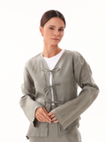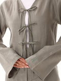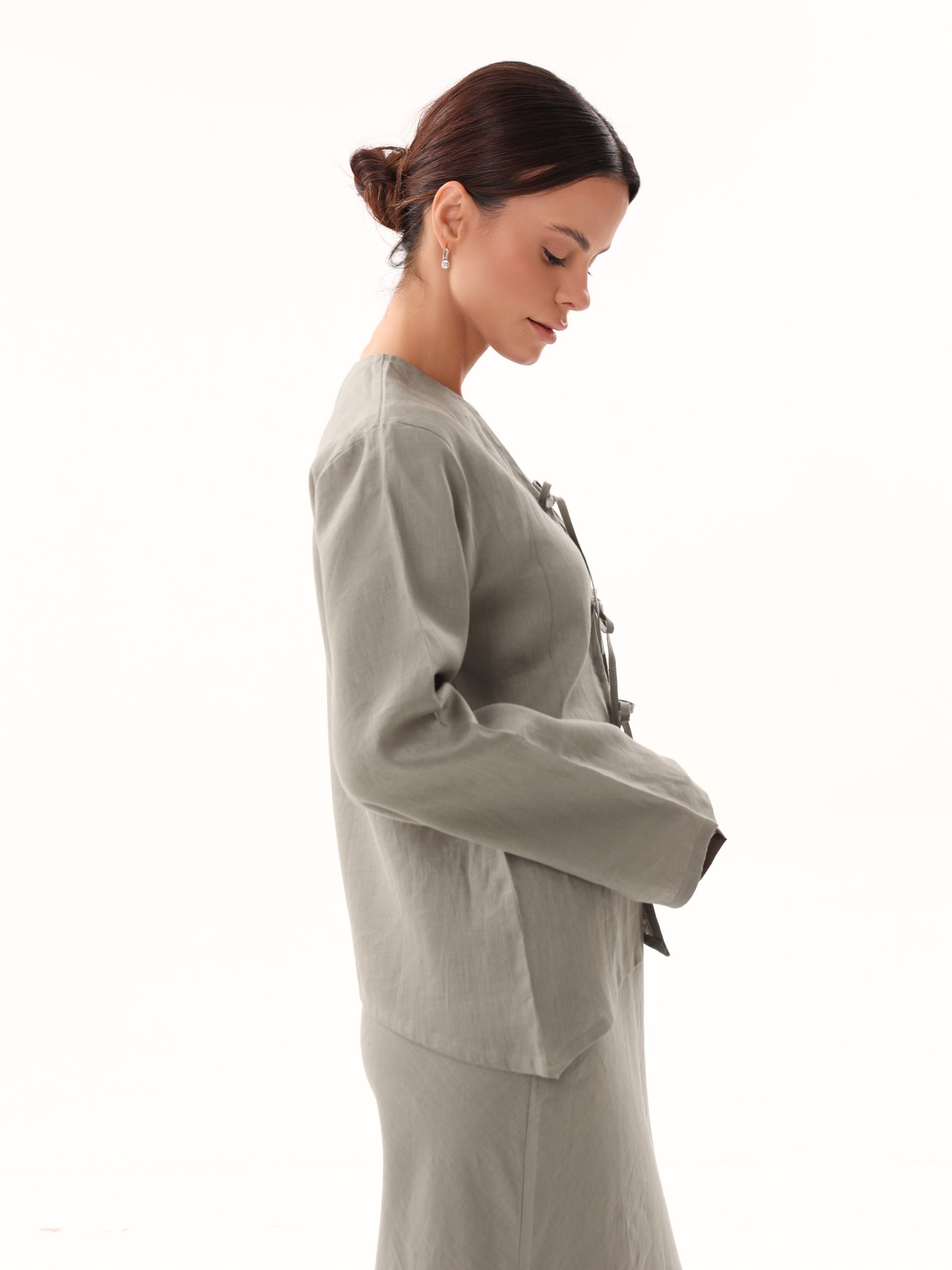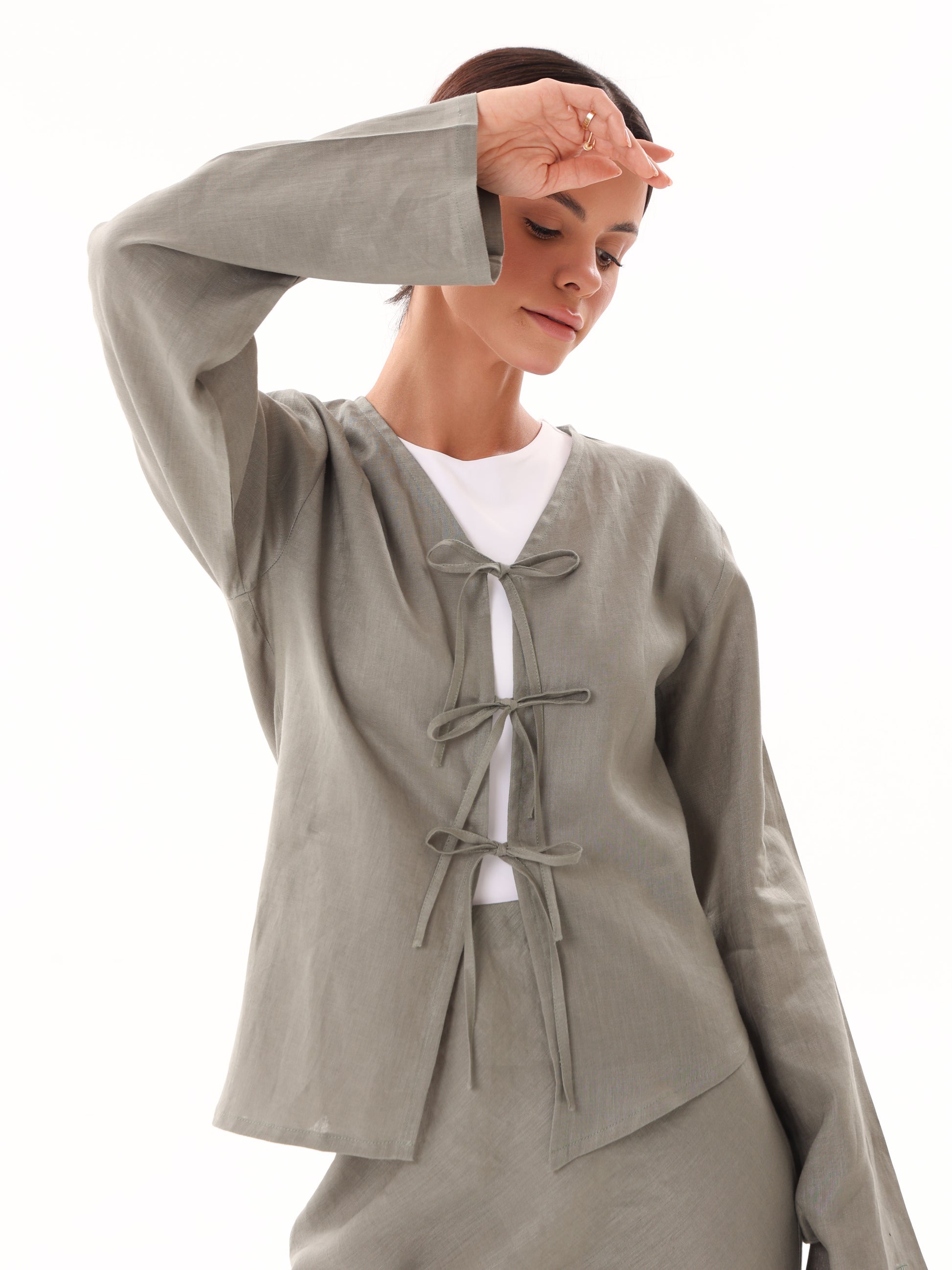 A feminine open top featuring bow ties at the front, wide sleeves, and a sleek asymmetrical design. Made from 100% pure linen, it is breathable and perfect for warm weather. For a laid back look, pair it with our linen trousers, or dress it up with our linen maxi skirts. It also looks great layered over our linen underdress for a modest yet stylish outfit.