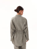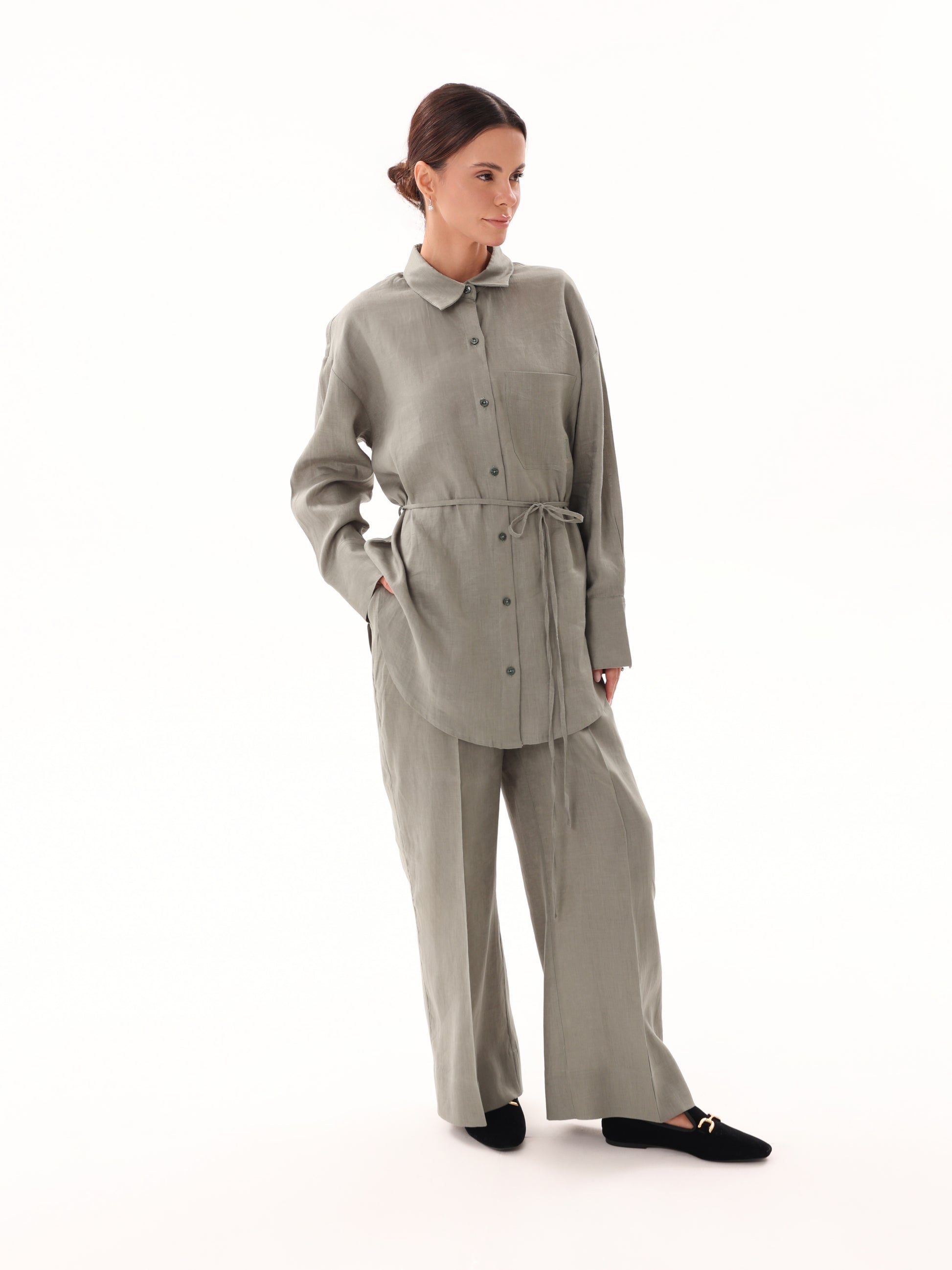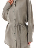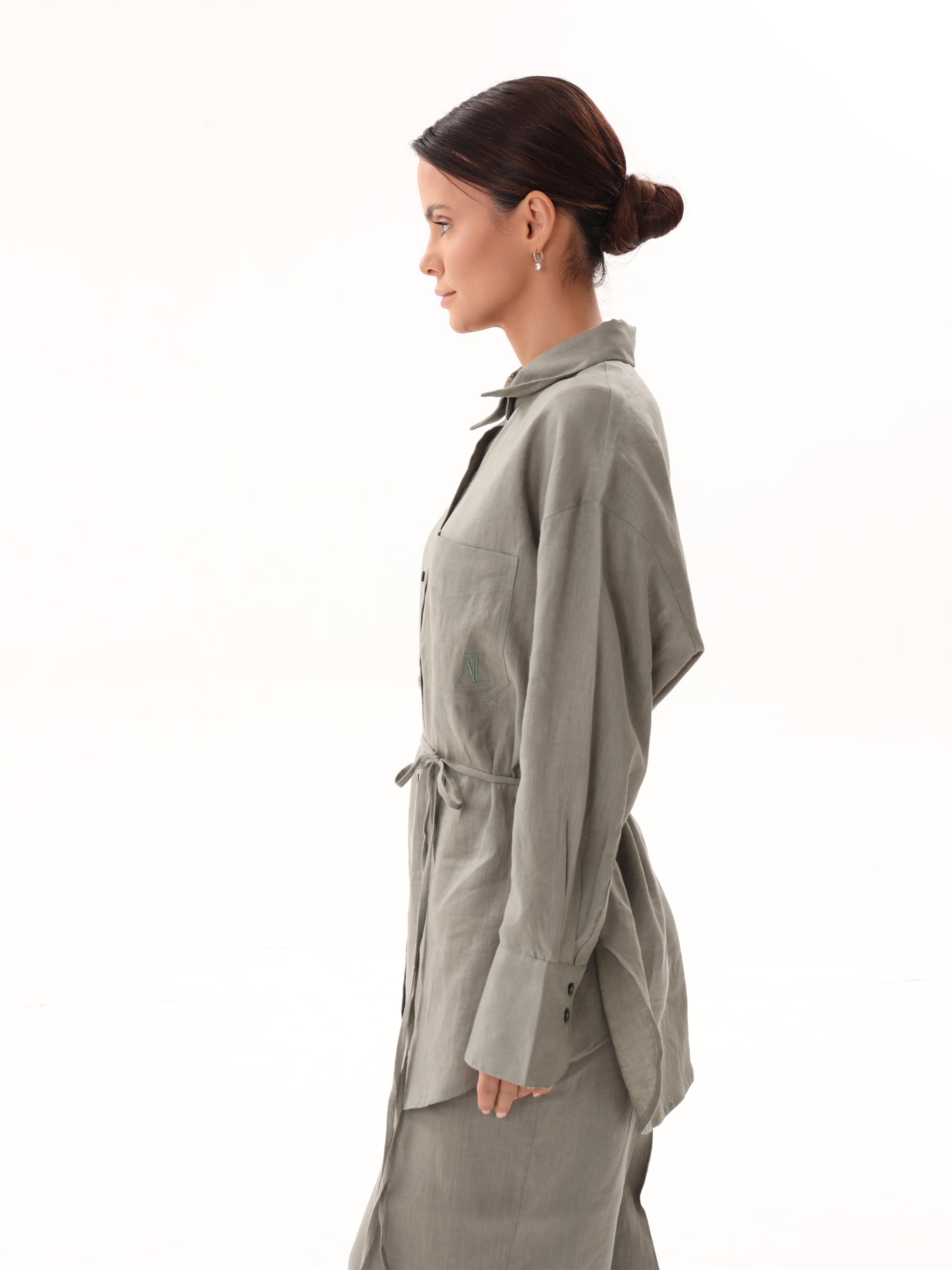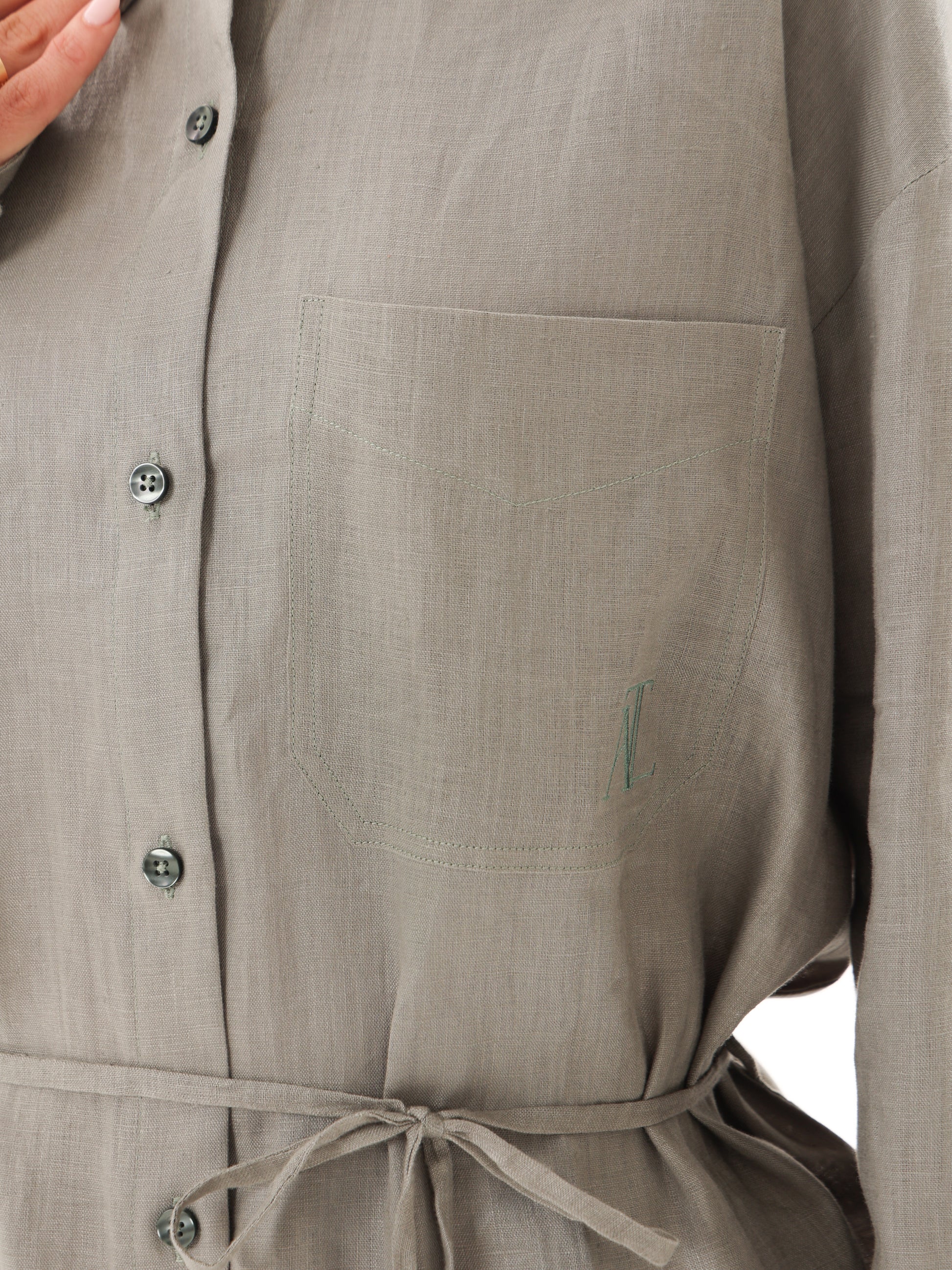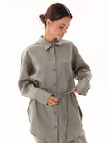 An oversized linen shirt, designed for effortless style and comfort. Featuring a removable tie belt at the waist and a chest pocket with our signature embroidered logo, this shirt is a perfect blend of chic and laid-back. Crafted from 100% pure linen, it is lightweight and breathable, making it an ideal choice for warmer days. Pair it with other pieces from our Linen Bow Tie Line for endless versatile looks.