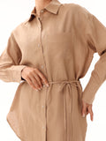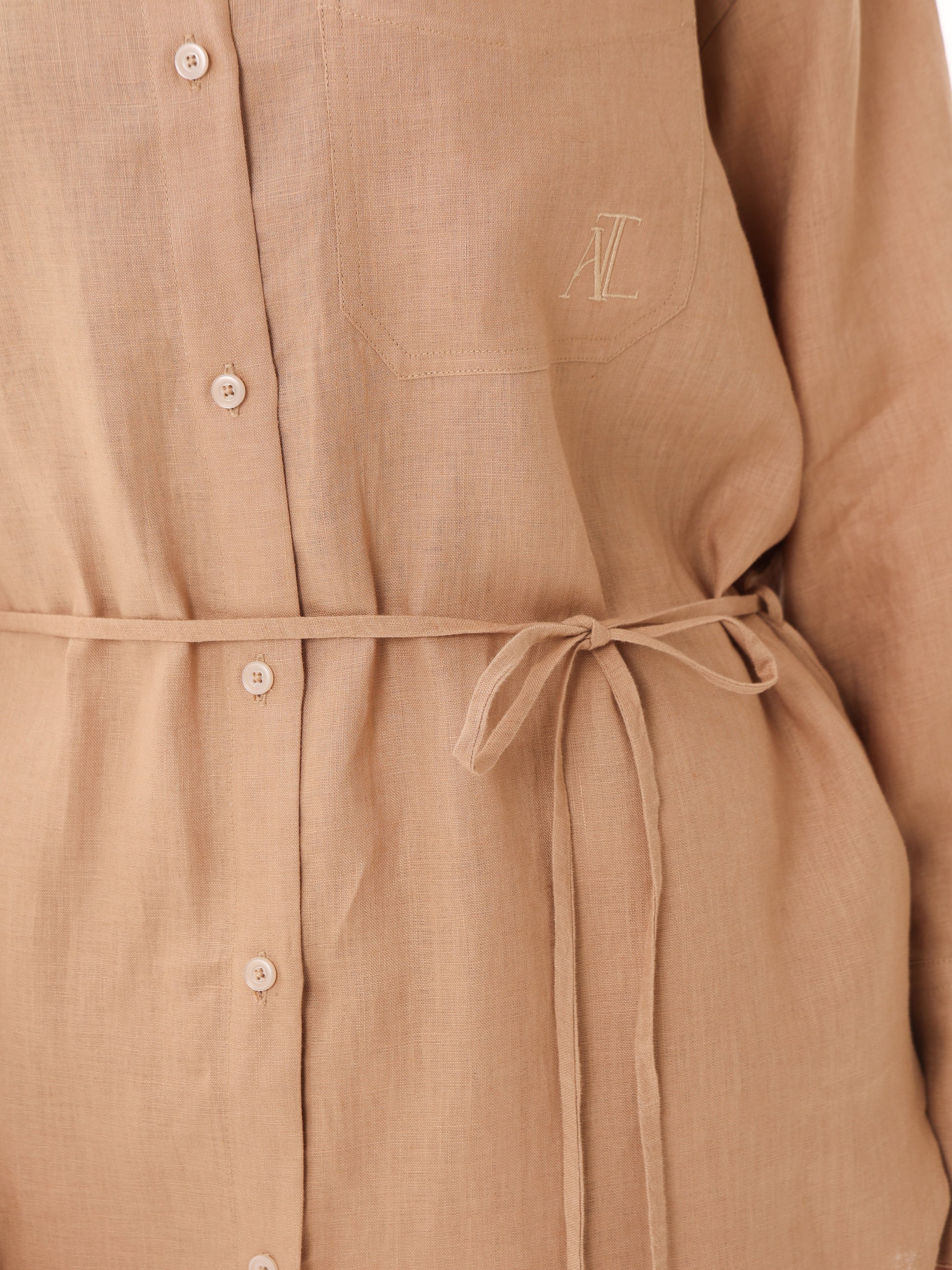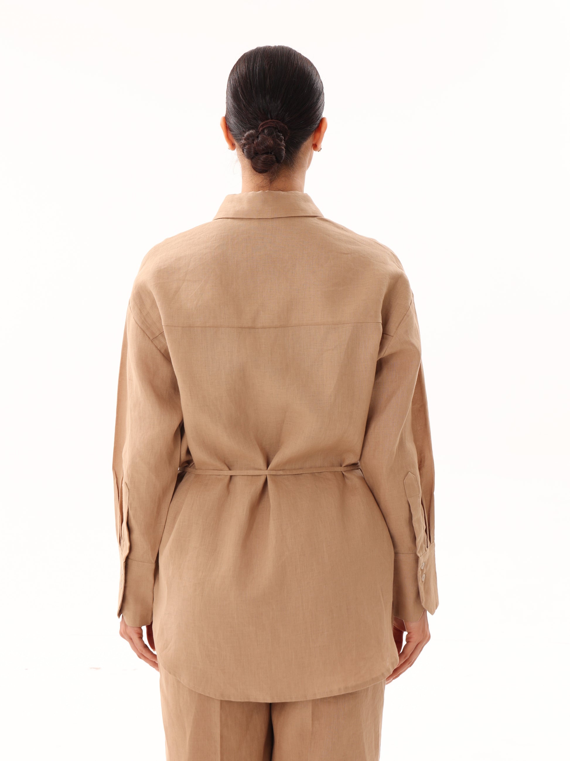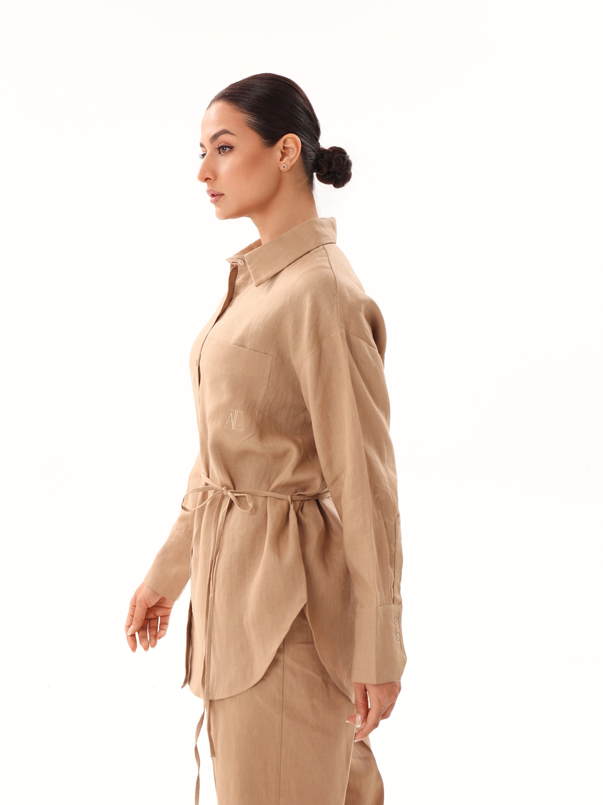 An oversized linen shirt, designed for effortless style and comfort. Featuring a removable tie belt at the waist and a chest pocket with our signature embroidered logo, this shirt is a perfect blend of chic and laid-back. Crafted from 100% pure linen, it is lightweight and breathable, making it an ideal choice for warmer days. Pair it with other pieces from our Linen Bow Tie Line for endless versatile looks.