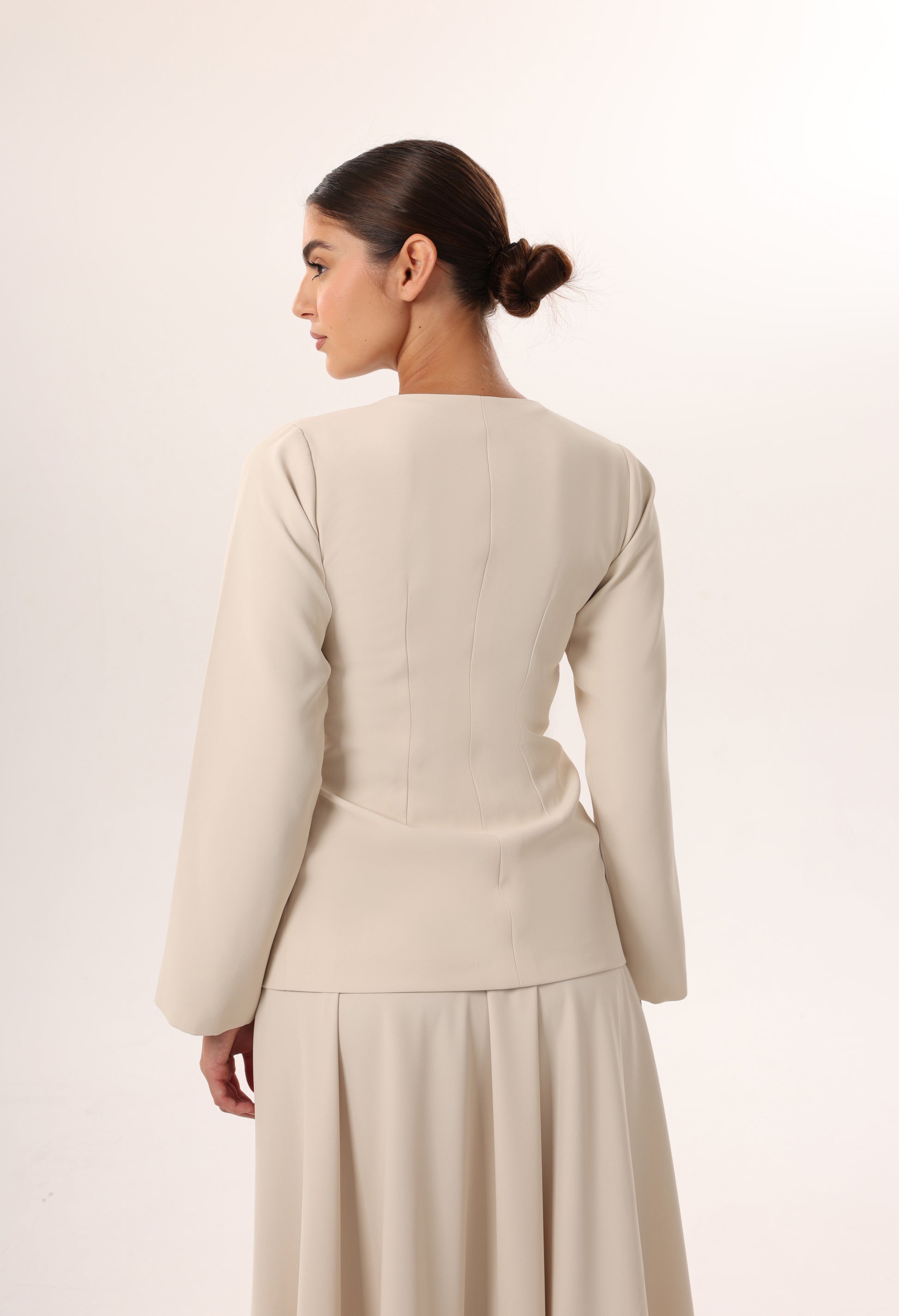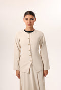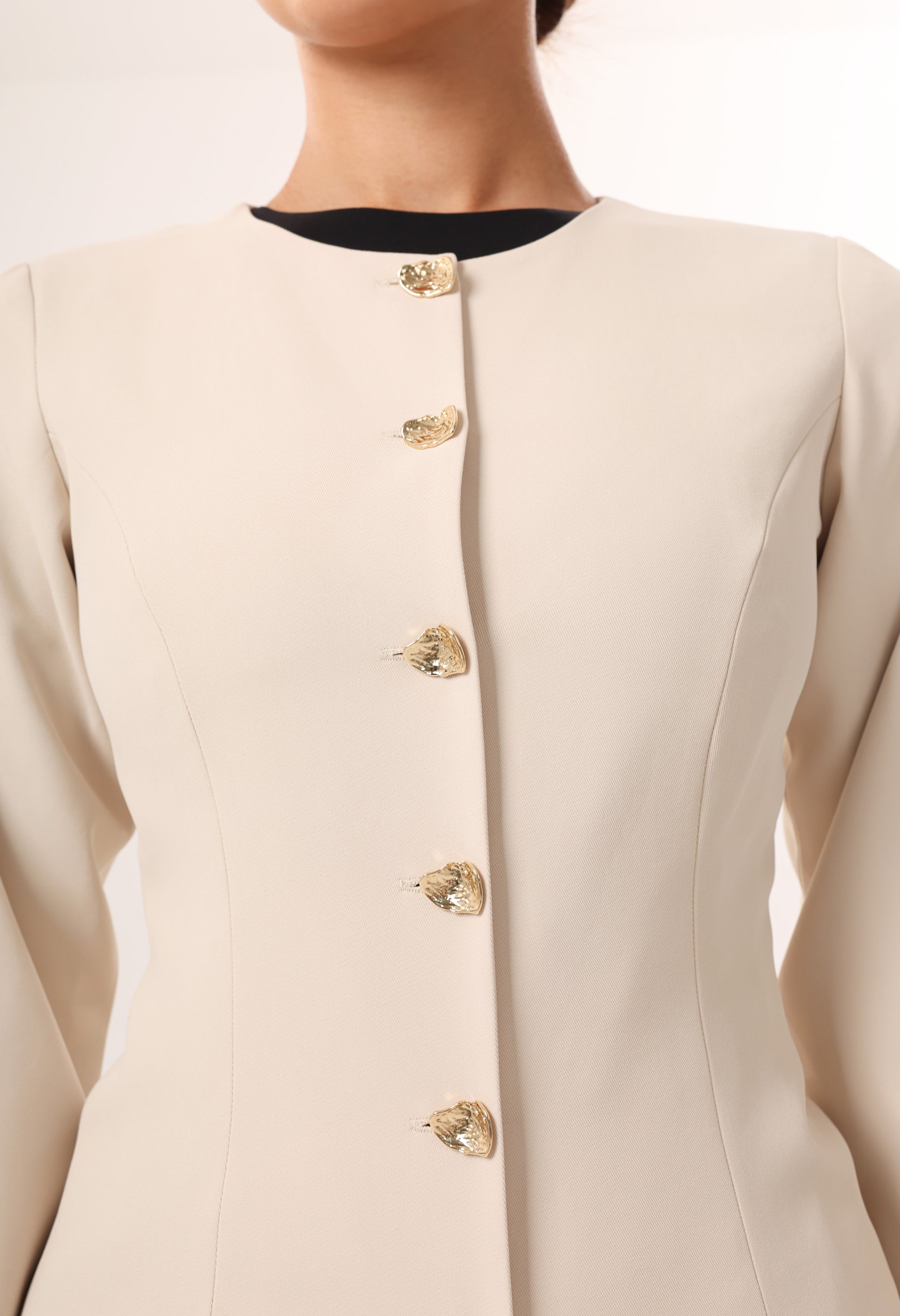 This long-sleeved jacket features a round neckline and a clean, elongated silhouette. Designed with subtle shaping seams, it offers a tailored fit through the torso that enhances the waist while maintaining ease of movement. Cut to sit just below the waist, it provides coverage and styling flexibility. Can be worn over dresses, skirts, or trousers. The front is finished with irregular-shaped gold buttons, adding a subtle yet distinctive statement. Rendered with tonal stitching, this piece blends minimalist elegance with a polished, modern edge.