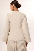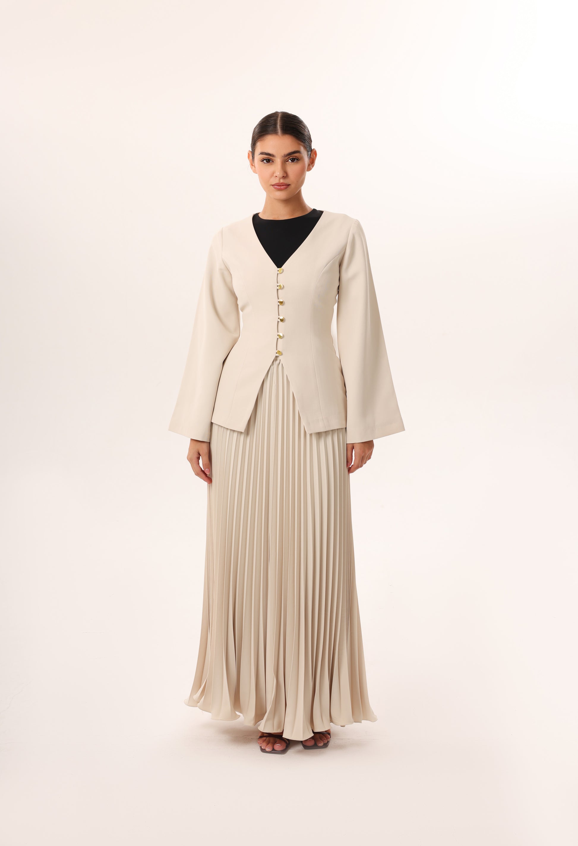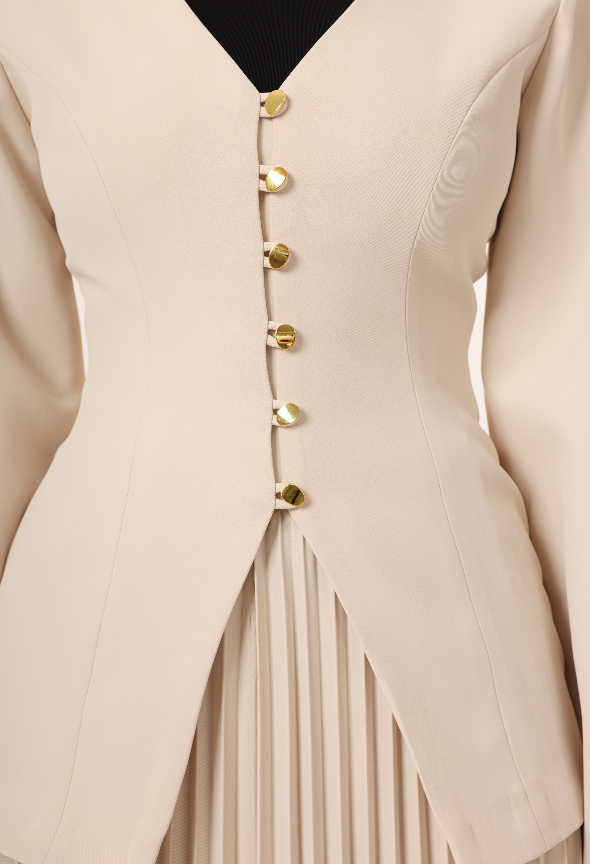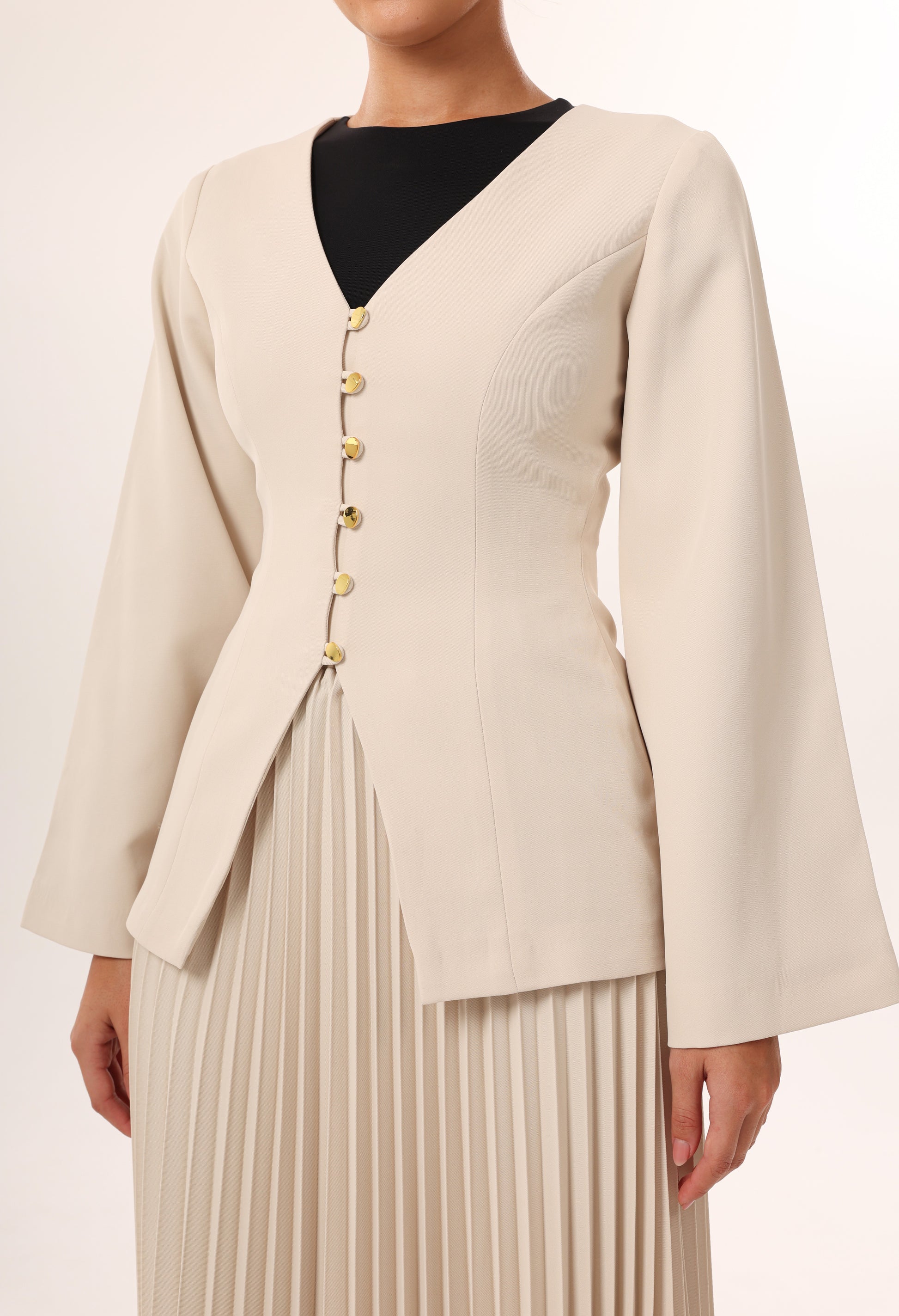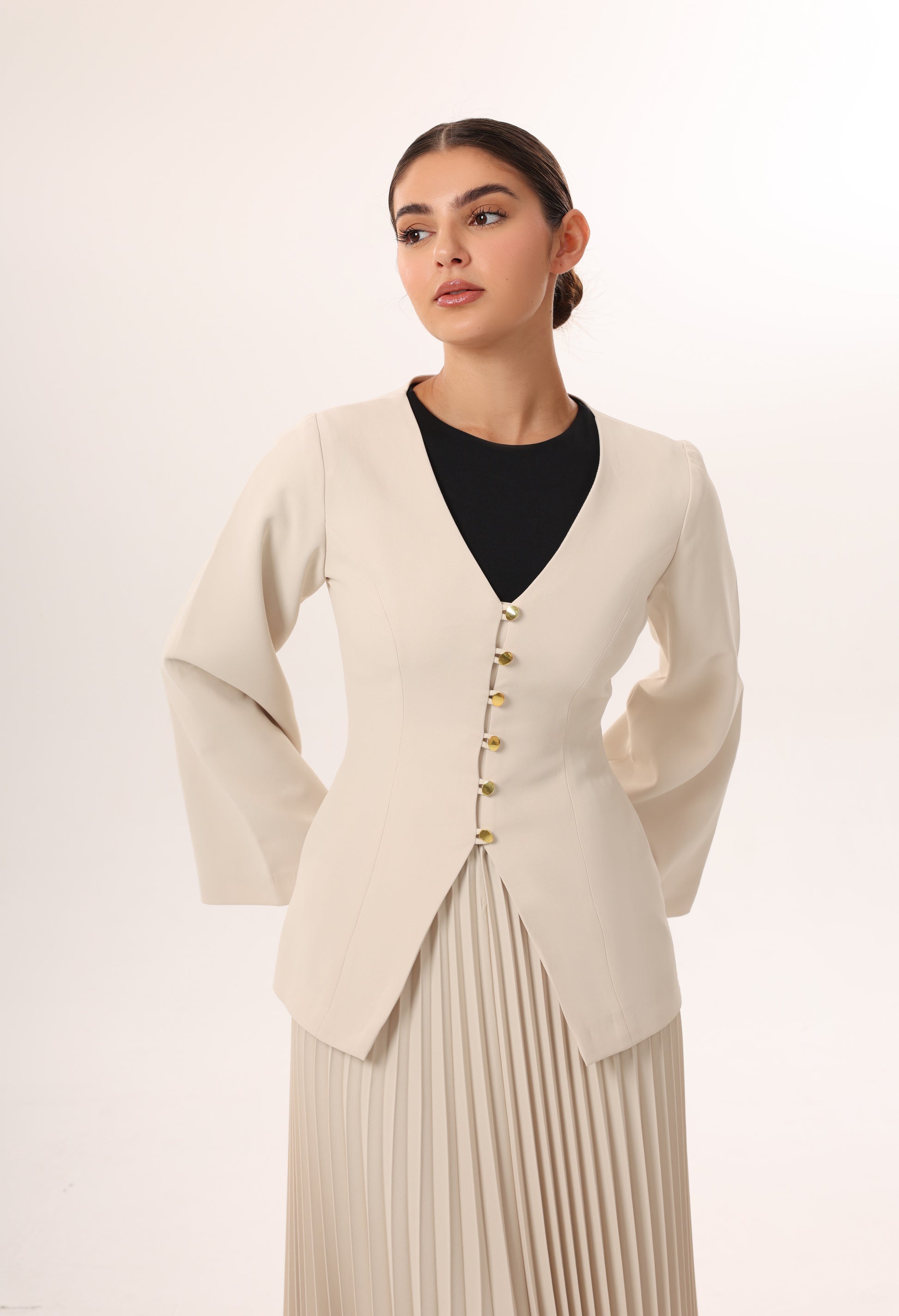 This structured jacket features a deep V-neckline and an architectural silhouette that balances structure with ease. The shoulders are gently dropped, and the proportions are elongated for added coverage, offering a modest yet contemporary look. A center-front slit at the bottom hem adds subtle movement and ease, allowing the jacket to drape naturally whether worn open or closed. The front is finished with irregular-shaped gold buttons, adding a sculptural, on-trend accent to the clean lines.