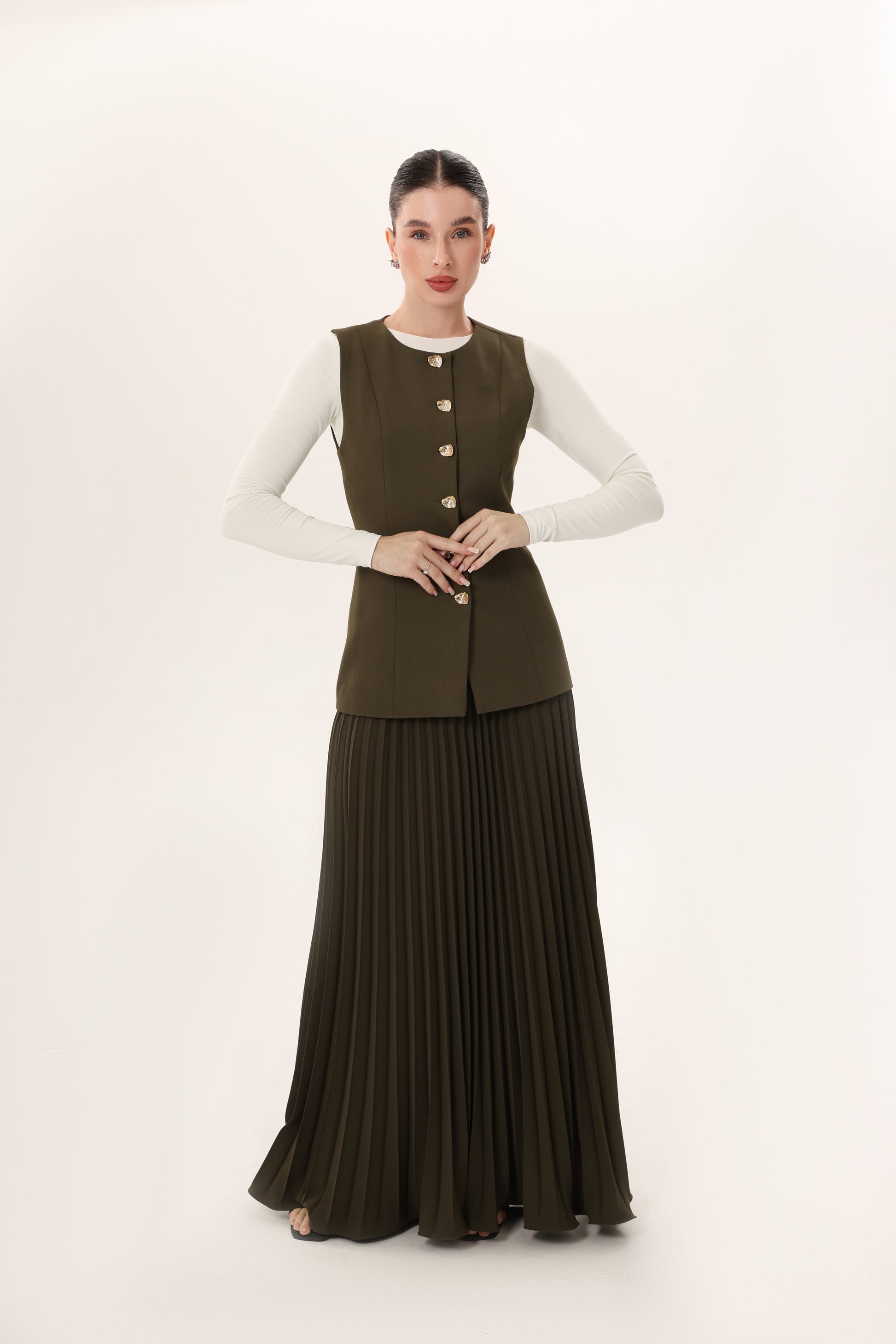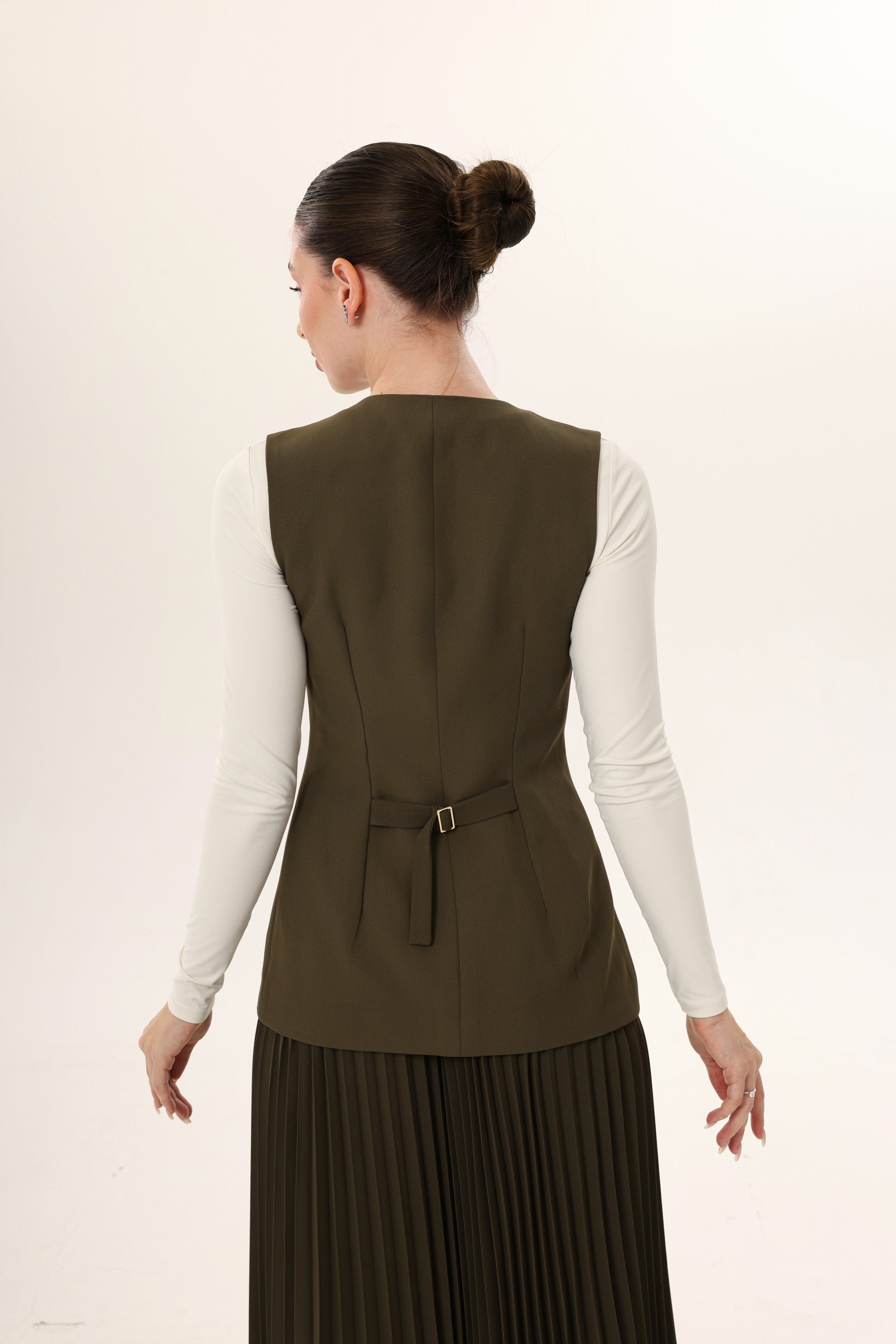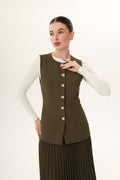 This sleeveless vest features a round neckline and a clean, structured silhouette. Designed for versatility, it offers a tailored fit through the torso with subtle shaping seams for a refined look. The back includes an adjustable buckle strap, allowing for a customizable cinch for definition or left loose for a more modest, relaxed look. Cut longer than traditional vests, it provides added coverage and styling flexibility—perfect for layering over dresses, trousers, or skirts. at the waist. The front is finished with irregular-shaped gold buttons, adding a subtle statement. Rendered with tonal stitching, this piece blends utilitarian edge with minimalist elegance.