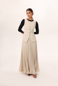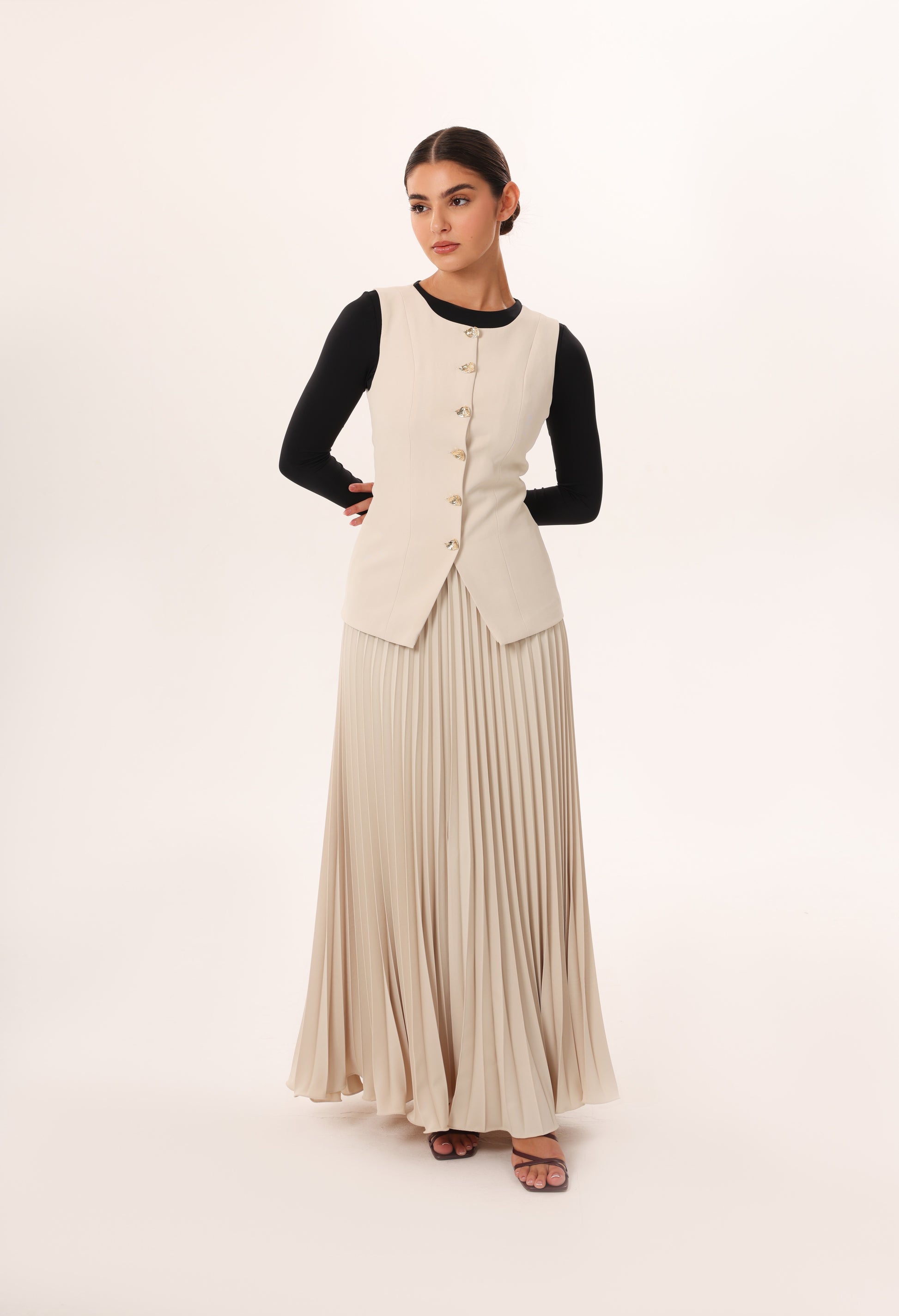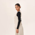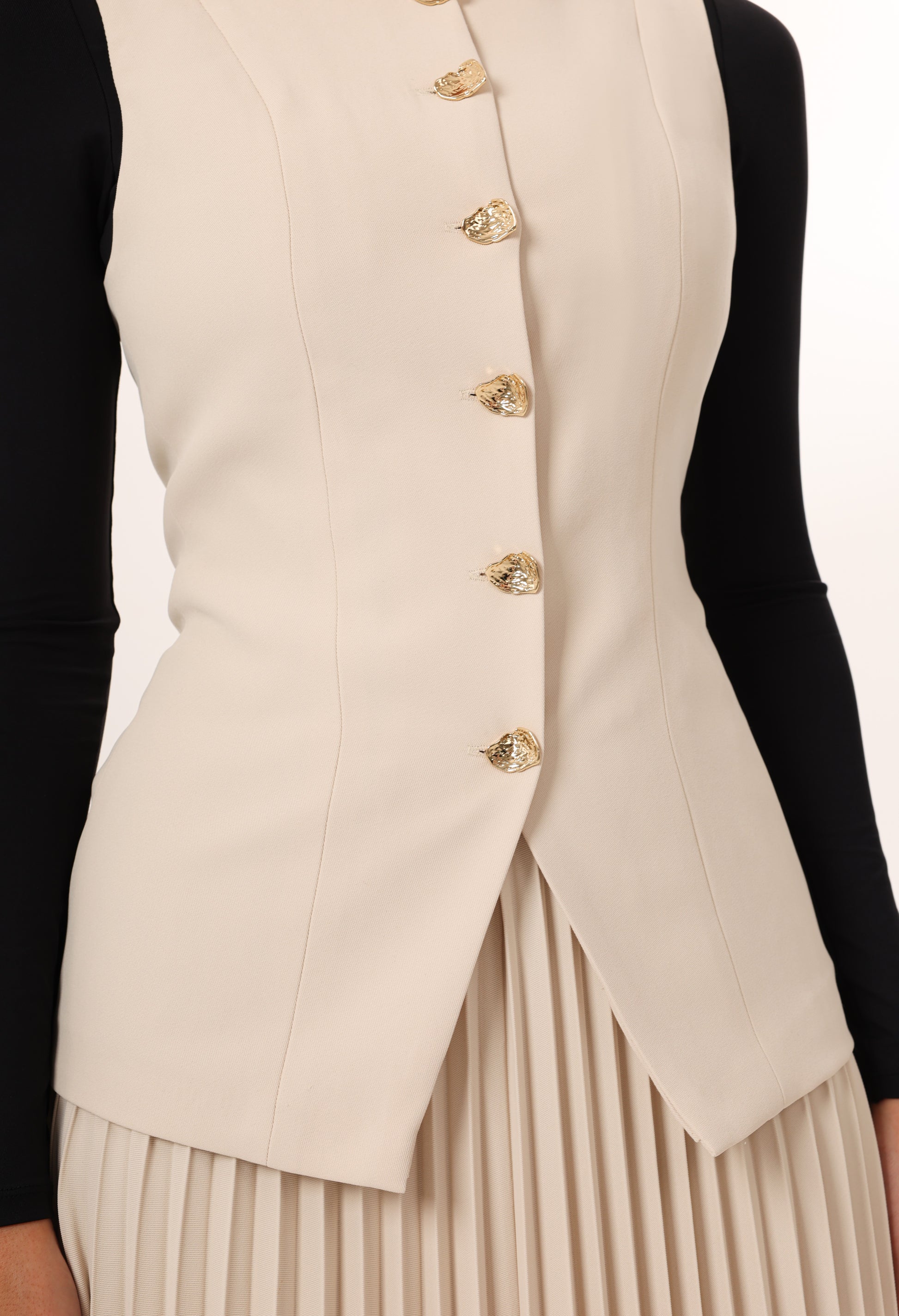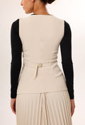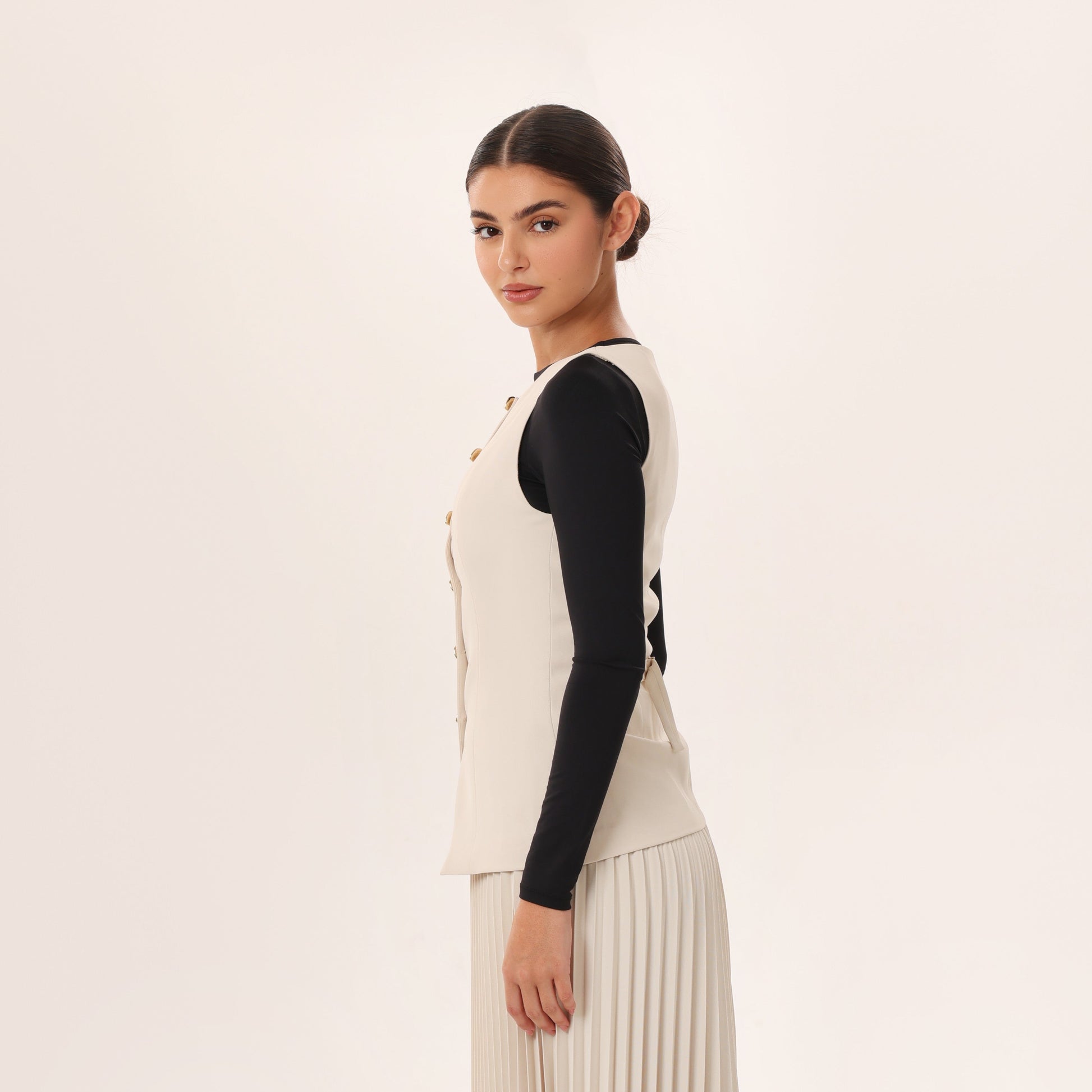 This sleeveless vest features a round neckline and a clean, structured silhouette. Designed for versatility, it offers a tailored fit through the torso with subtle shaping seams for a refined look. The back includes an adjustable buckle strap, allowing for a customizable cinch for definition or left loose for a more modest, relaxed look. Cut longer than traditional vests, it provides added coverage and styling flexibility-perfect for layering over dresses, trousers, or skirts. at the waist. The front is finished with irregular-shaped gold buttons, adding a subtle statement. Rendered with tonal stitching, this piece blends utilitarian edge with minimalist elegance.